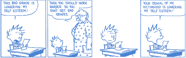 In the Calvin and Hobbs cartoons above and below we are given a clear idea of how fixed mindset people tend to think about esteem and try, using self defeating strategies, to protect themselves from those circumstances that would diminish that esteem. Of course they may be much less aware of what they are doing than Calvin is.